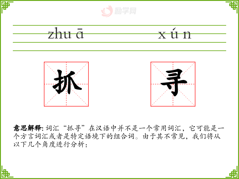 词汇“抓寻”在汉语中并不是一个常用词汇,它可能是一个方言词汇或者是特定语境下的组合词。由于其不常见,我们将从以下几个角度进行分析: