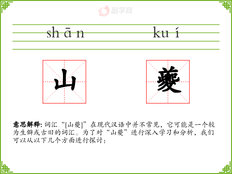 词汇“[山夔]”在现代汉语中并不常见,它可能是一个较为生僻或古旧的词汇。为了对“山夔”进行深入学*和分析,我们可以从以下几个方面进行探讨: