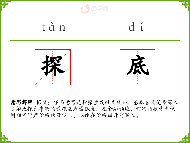 探底:字面意思是指探索或触及底部,基本含义是指深入了解或探究事物的最深层或最低点。在金融领域,它特指投资者试图确定资产价格的最低点,以便在价格回升前买入。