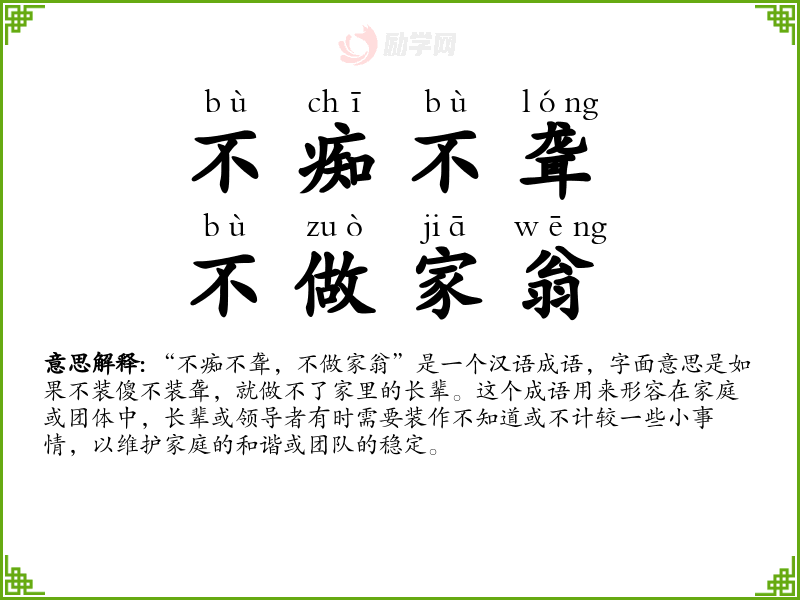 “不痴不聋,不做家翁”是一个汉语成语,字面意思是如果不装傻不装聋,就做不了家里的长辈。这个成语用来形容在家庭或团体中,长辈或领导者有时需要装作不知道或不计较一些小事情,以维护家庭的和谐或团队的稳定。