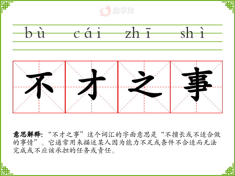 “不才之事”这个词汇的字面意思是“不擅长或不适合做的事情”。它通常用来描述某人因为能力不足或条件不合适而无法完成或不应该承担的任务或责任。