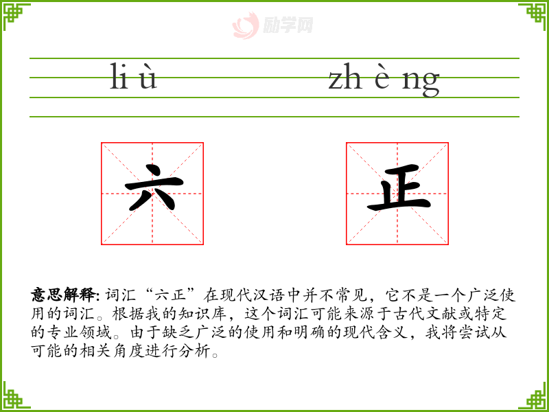 由于“六正”不是一个常见的现代词汇,它在文学、口语或专业领域中的使用非常有限。在古代文献中,它可能与道德、政治或哲学有关,但具体内容需要查阅相关历史文献。