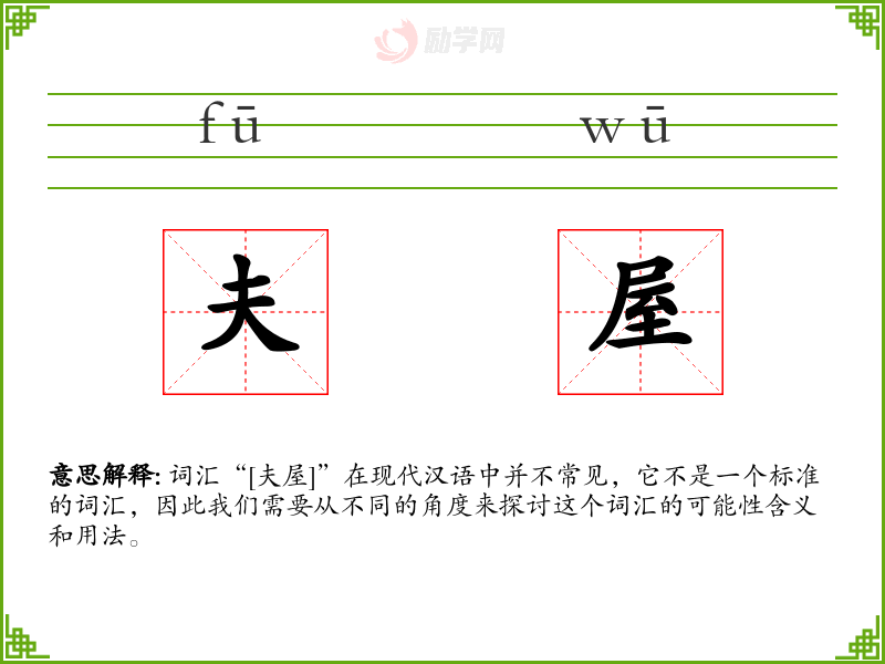 由于“[夫屋]”不是一个标准的词汇,我们无法给出一个确切的字面意思和基本含义。它可能是由两个字“夫”和“屋”组合而成的,但这种组合在现代汉语中并不具有明确的意义。