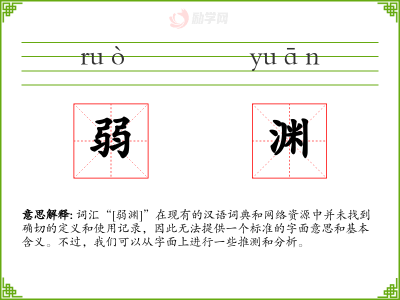 “弱”通常指力量小、不强壮或脆弱的状态,而“渊”则常指深水、深潭或深邃的地方。结合起来,“弱渊”可能指的是一个看似深邃但实际上力量*弱或不稳定的状态或地方。