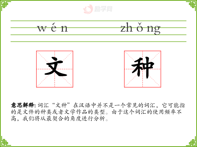 - 文学语境:在文学研究中,“文种”可能指的是不同类型的文学作品,如叙事文、抒情文、议论文等。