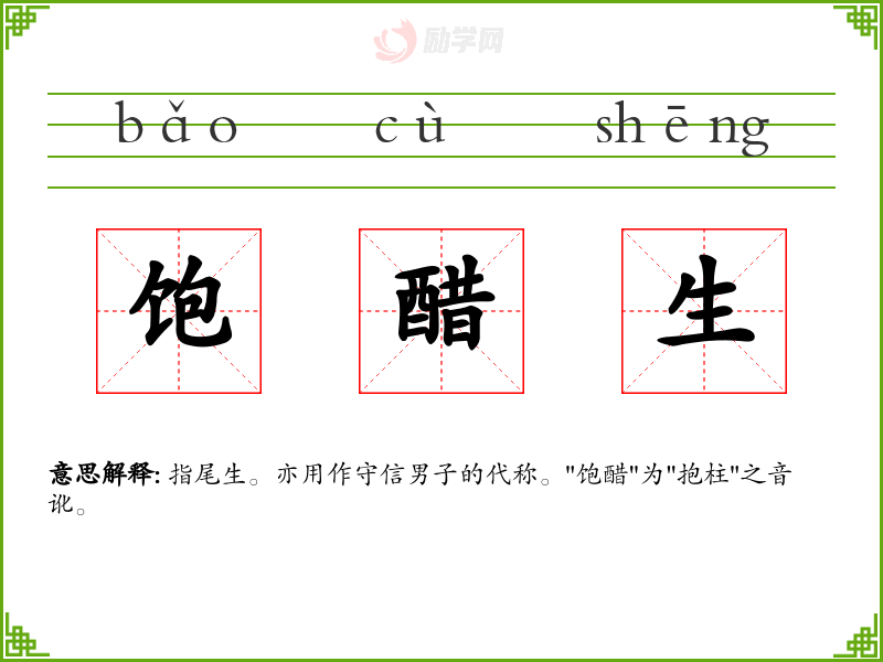 饱醋生的意思是:指尾生。亦用作守信男子的代称。"饱醋"为"抱柱"之音讹。