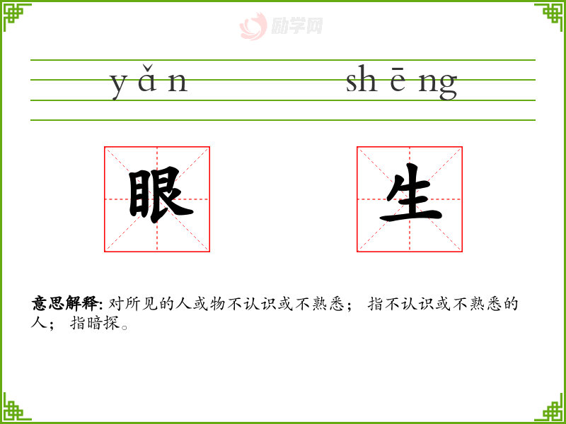 眼生的意思是:对所见的人或物不认识或不熟悉; 指不认识或不熟悉的人; 指暗探。