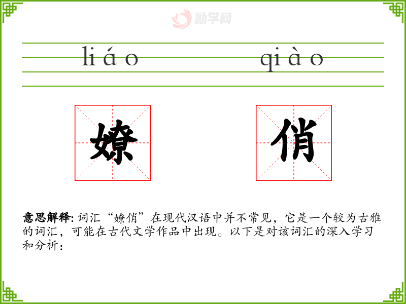 词汇“嫽俏”在现代汉语中并不常见,它是一个较为古雅的词汇,可能在古代文学作品中出现。以下是对该词汇的深入学*和分析: