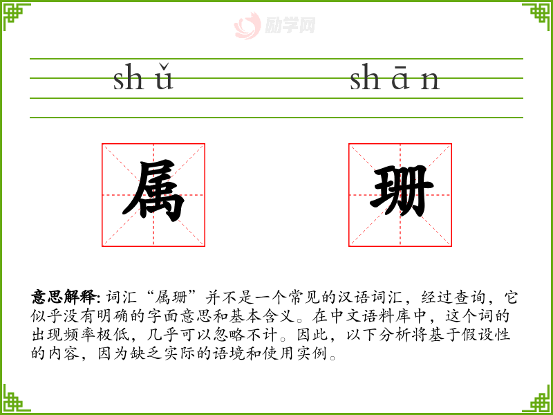 由于“属珊”不是一个标准词汇,我们无法提供确切的基本定义。它可能是一个专有名词,比如人名、地名或者特定文化中的术语,但在中文语境中并不常见。