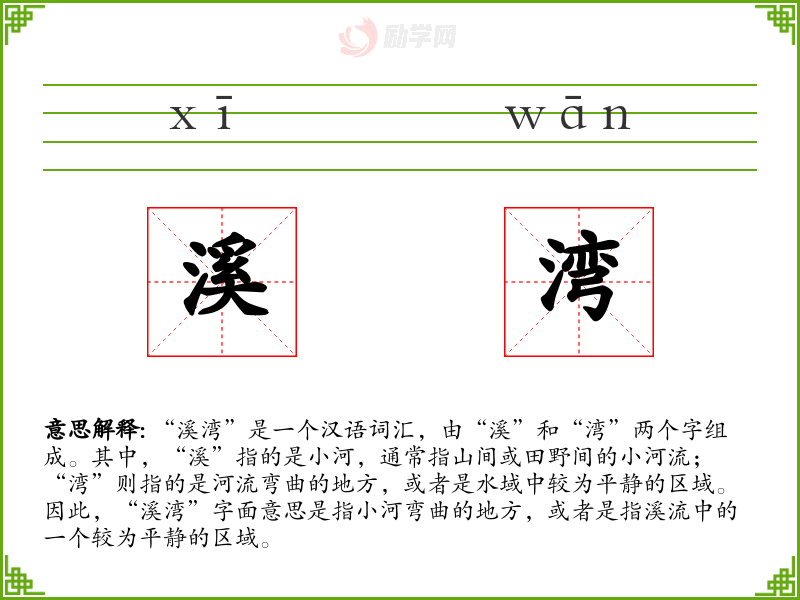 “溪”字最早见于甲骨文,原意为小河,后来逐渐演变为指山间的小河流。“湾”字则较晚出现,最初指水域的弯曲部分,后来也用来指海岸线的弯曲部分。两个字的结合,“溪湾”,则是在描述自然景观时逐渐形成的词汇。