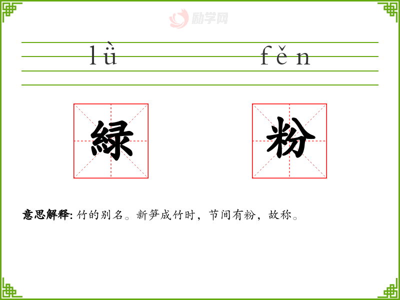 緑粉的意思是:竹的别名。新笋成竹时,节间有粉,故称。