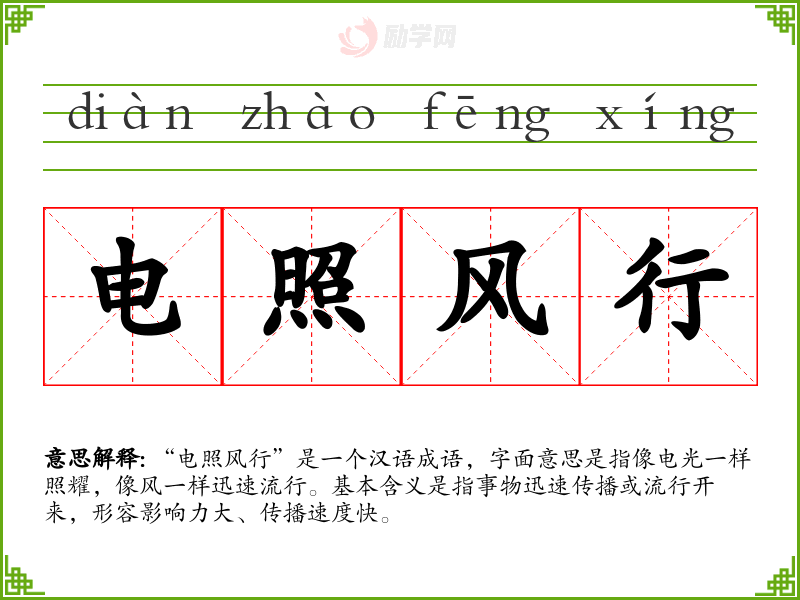 “电照风行”是一个汉语成语,字面意思是指像电光一样照耀,像风一样迅速流行。基本含义是指事物迅速传播或流行开来,形容影响力大、传播速度快。