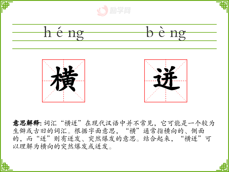 词汇“横迸”在现代汉语中并不常见,它可能是一个较为生僻或古旧的词汇。根据字面意思,“横”通常指横向的、侧面的,而“迸”则有迸发、突然爆发的意思。结合起来,“横迸”可以理解为横向的突然爆发或迸发。