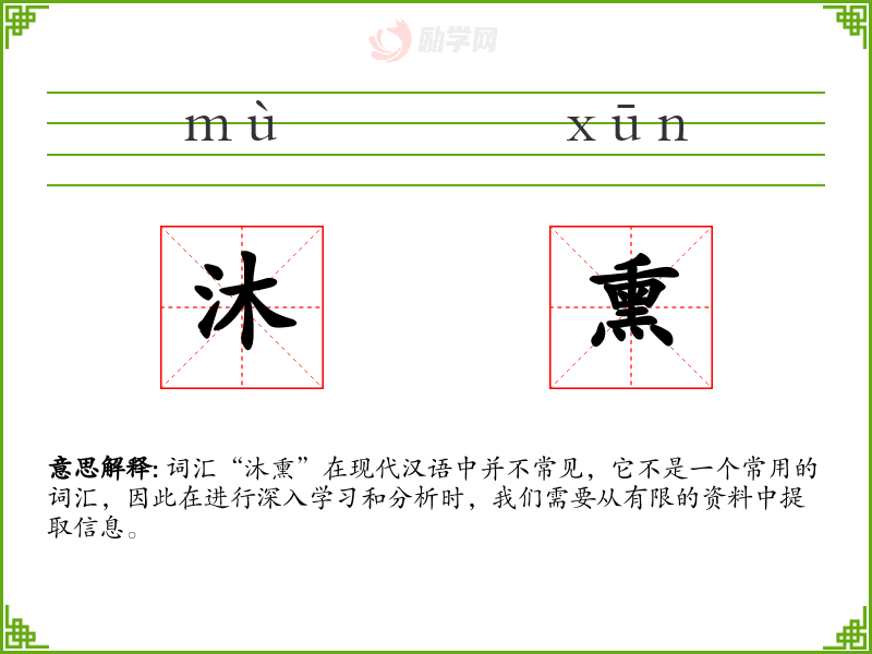由于“沐熏”不是一个常用词汇,它在文学作品中可能出现,用以表达某种深刻的熏陶或教育意义。在口语和专业领域中,这个词汇可能不太常见。