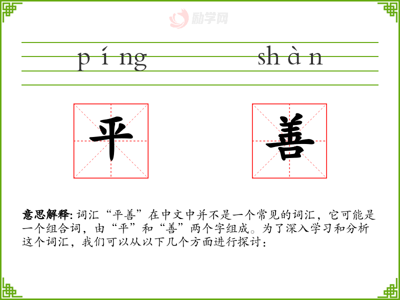 词汇“平善”在中文中并不是一个常见的词汇,它可能是一个组合词,由“平”和“善”两个字组成。为了深入学*和分析这个词汇,我们可以从以下几个方面进行探讨: