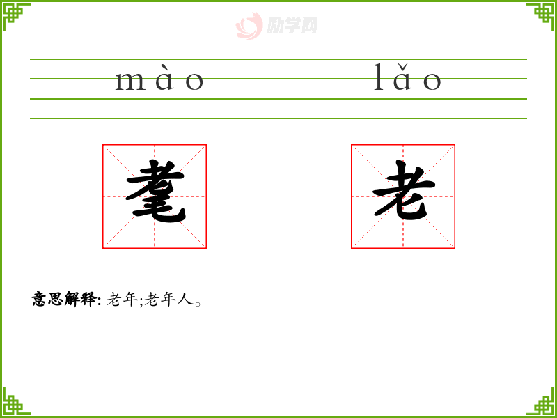 (形声。从老,毛声。本义:年老)。