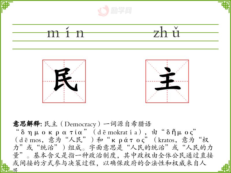 民主(Democracy)一词源自希腊语“δημοκρατία”(dēmokratía),由“δῆμος”(dēmos,意为“人民”)和“κράτος”(kratos,意为“权力”或“统治”)组成。字面意思是“人民的统治”或“人民的力量”。基本含义是指一种政治制度,其中政权由全体公民通过直接或间接的方式参与决策过程,以确保政府的合法性和权威来自人民。