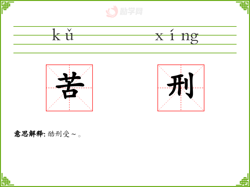 《史记·陈涉世家》-刑其长吏。 明·张溥《五人墓碑记》-五人之当刑。 清·方苞《狱中杂记》-彼于刑者。 《孟子·梁惠王上》-从而刑之。