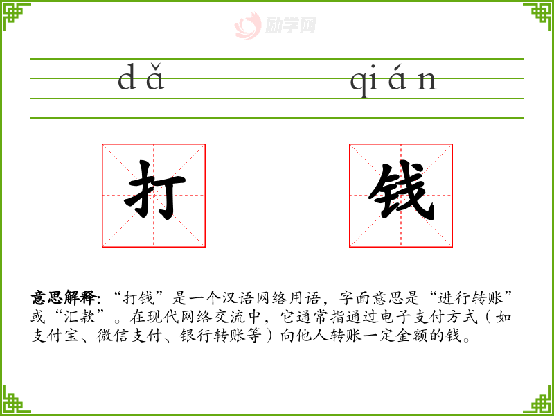 “打钱”是一个汉语网络用语,字面意思是“进行转账”或“汇款”。在现代网络交流中,它通常指通过电子支付方式(如支付宝、微信支付、银行转账等)向他人转账一定金额的钱。