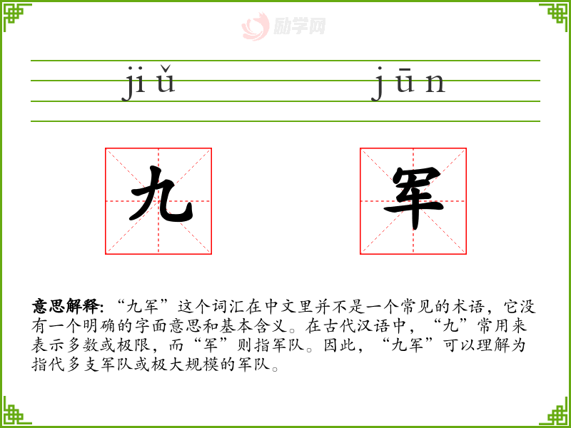 “九军”这个词汇虽然不常见,但它能够传达出军队的庞大和战争的规模。在语言学*和表达中,了解这样的词汇可以帮助我们更好地理解古代文学作品和历史描述。