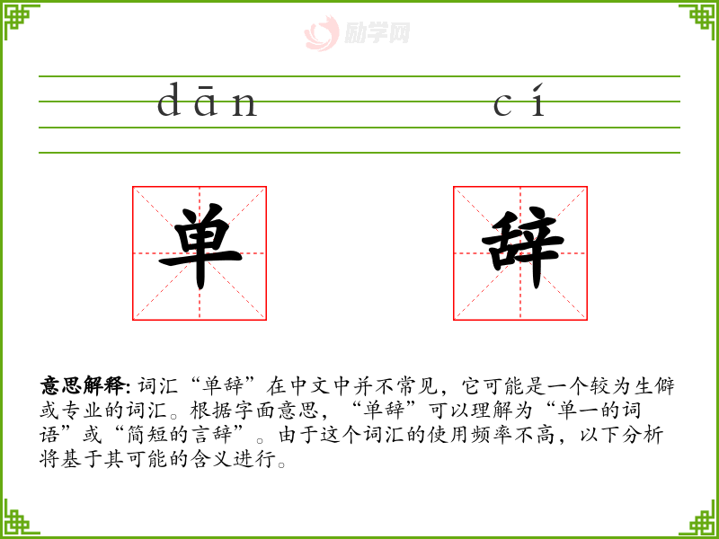 “单辞”可能让人联想到简洁、直接和有力,这种表达方式往往能迅速传达信息,给人留下深刻印象。