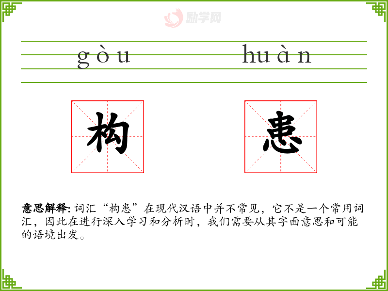词汇“构患”在现代汉语中并不常见,它不是一个常用词汇,因此在进行深入学习和分析时,我们需要从其字面意思和可能的语境出发。