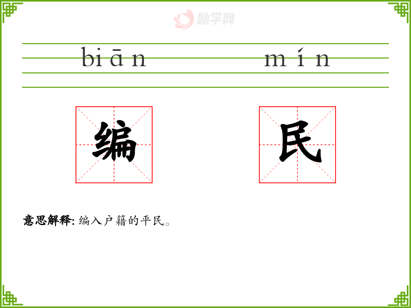 《说文》-编,次简也。 《声类》-以绳次物曰编。 《谷梁传·桓公元年》-春秋编年,四时具而后为年。 柳宗元《驳复仇议》-且请编之于令,永为国典。