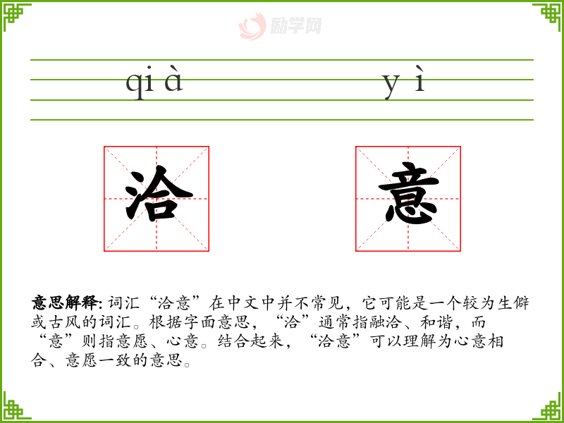 词汇“洽意”在中文中并不常见,它可能是一个较为生僻或古风的词汇。根据字面意思,“洽”通常指融洽、和谐,而“意”则指意愿、心意。结合起来,“洽意”可以理解为心意相合、意愿一致的意思。