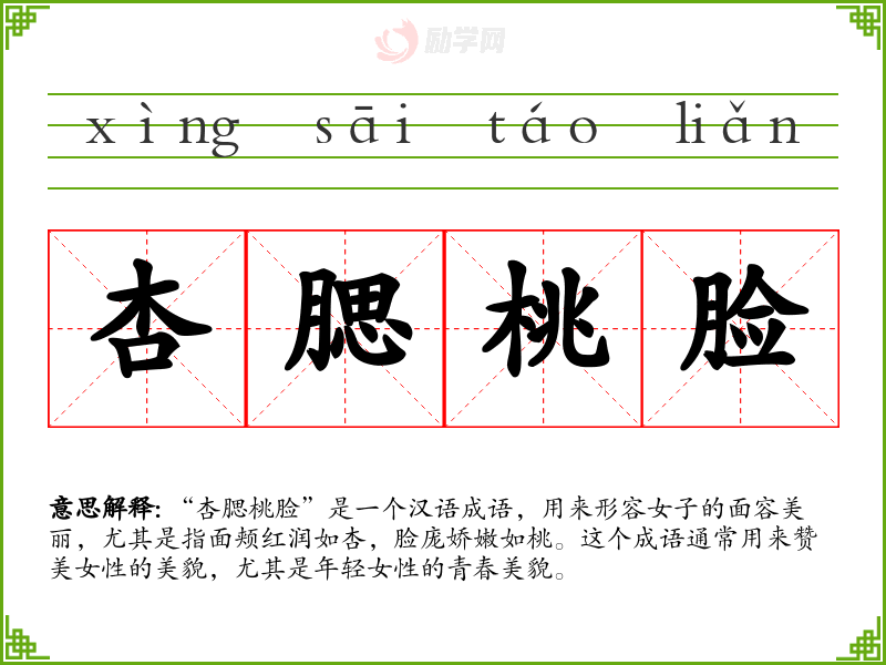 “杏腮桃脸”这个成语不仅是对女性美貌的一种赞美,也是*文化中对美的一种理想化表达。在学这个成语的过程中,我更加理解了汉语中对美的描述和表达方式,以及这些表达在不同文化和语境中的应用和意义。这个成语在语言学*和表达中具有重要的美学和文化价值。