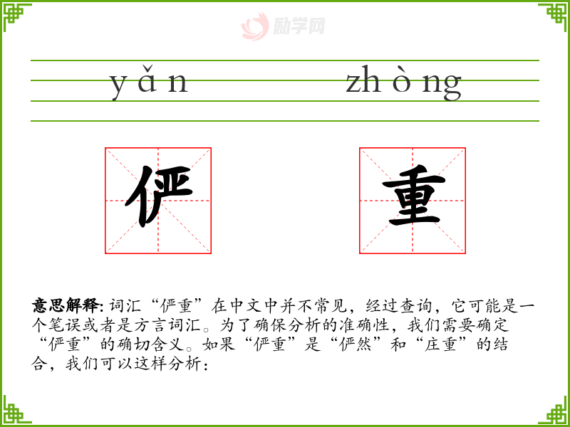 词汇“俨重”在中文中并不常见,经过查询,它可能是一个笔误或者是方言词汇。为了确保分析的准确性,我们需要确定“俨重”的确切含义。如果“俨重”是“俨然”和“庄重”的结合,我们可以这样分析: