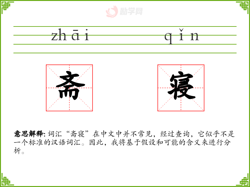 词汇“斋寝”在中文中并不常见,经过查询,它似乎不是一个标准的汉语词汇。因此,我将基于假设和可能的含义来进行分析。
