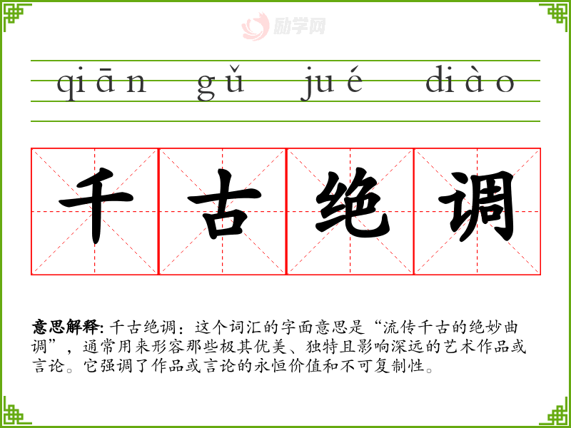 “千古绝调”这个词对我来说,不仅是一个形容词,更是一种对美好事物的追求和尊重。它提醒我在学*和生活中,要珍惜那些具有深远影响和永恒价值的东西。