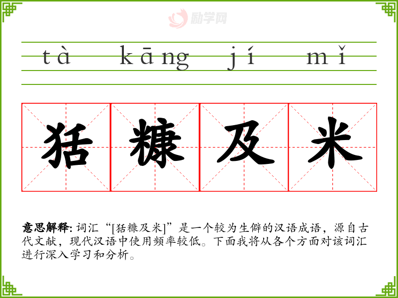 词汇“[狧糠及米]”是一个较为生僻的汉语成语,源自古代文献,现代汉语中使用频率较低。下面我将从各个方面对该词汇进行深入学*和分析。