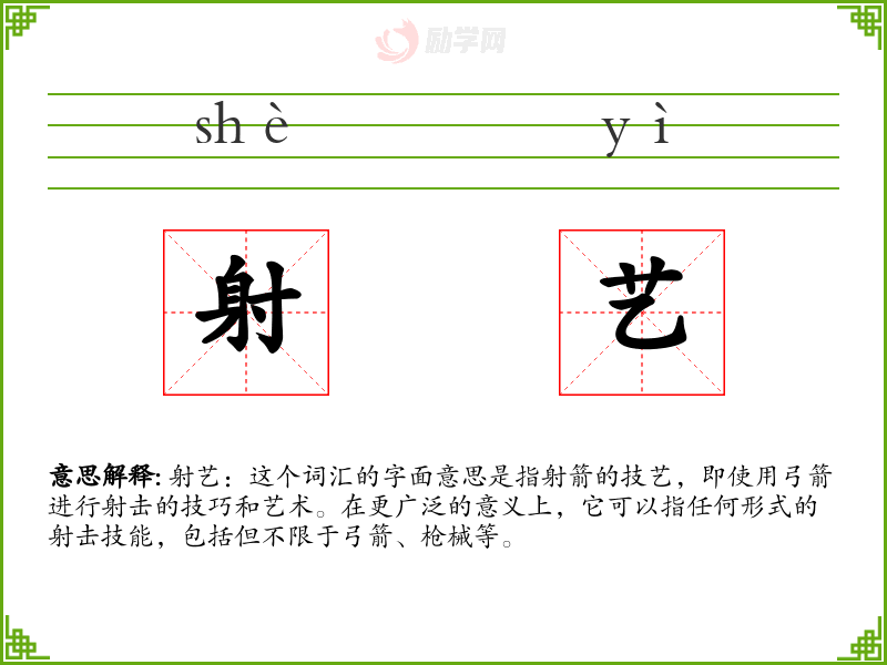 - 反义词:无(因为射艺是一个特定的技能,没有直接的反义词)