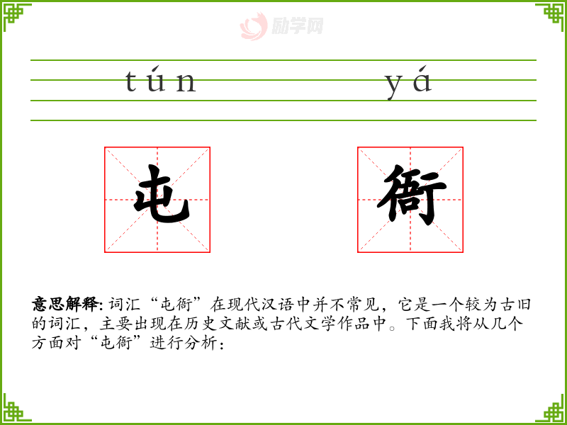 由于“屯衙”是一个较为古旧的词汇,现代生活中很少有机会直接使用。但在学*历史或古代文学时,了解这个词的含义和用法,可以帮助更深入地理解相关内容。