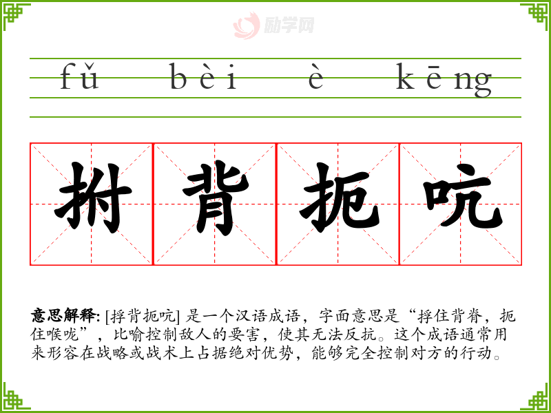 拊背扼吭的意思是:吭,喉咙。按住脊背,拤住咽喉。比喻控制要害。