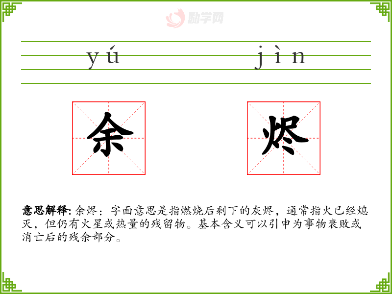 余烬:字面意思是指燃烧后剩下的灰烬,通常指火已经熄灭,但仍有火星或热量的残留物。基本含义可以引申为事物衰败或消亡后的残余部分。