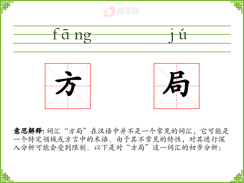 词汇“方局”在汉语中并不是一个常见的词汇,它可能是一个特定领域或方言中的术语。由于其不常见的特性,对其进行深入分析可能会受到限制。以下是对“方局”这一词汇的初步分析: