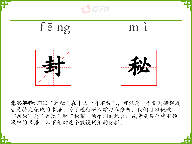 词汇“封秘”在中文中并不常见,可能是一个拼写错误或者是特定领域的术语。为了进行深入学习和分析,我们可以假设“封秘”是“封闭”和“秘密”两个词的结合,或者是某个特定领域中的术语。以下是对这个假设词汇的分析: