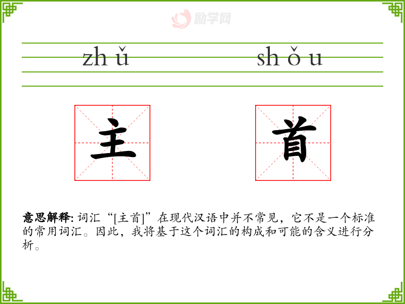 词汇“[主首]”在现代汉语中并不常见,它不是一个标准的常用词汇。因此,我将基于这个词汇的构成和可能的含义进行分析。