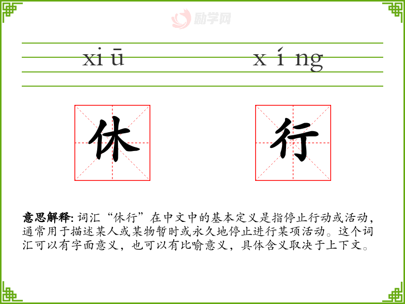 词汇“休行”在中文中的基本定义是指停止行动或活动,通常用于描述某人或某物暂时或永久地停止进行某项活动。这个词汇可以有字面意义,也可以有比喻意义,具体含义取决于上下文。