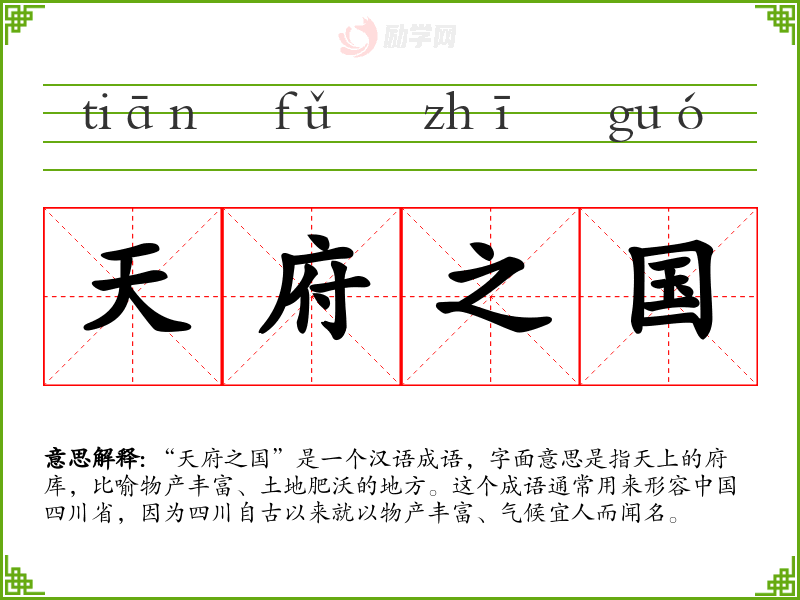 “天府之国”是一个汉语成语,字面意思是指天上的府库,比喻物产丰富、土地肥沃的地方。这个成语通常用来形容**四川省,因为四川自古以来就以物产丰富、气候宜人而闻名。