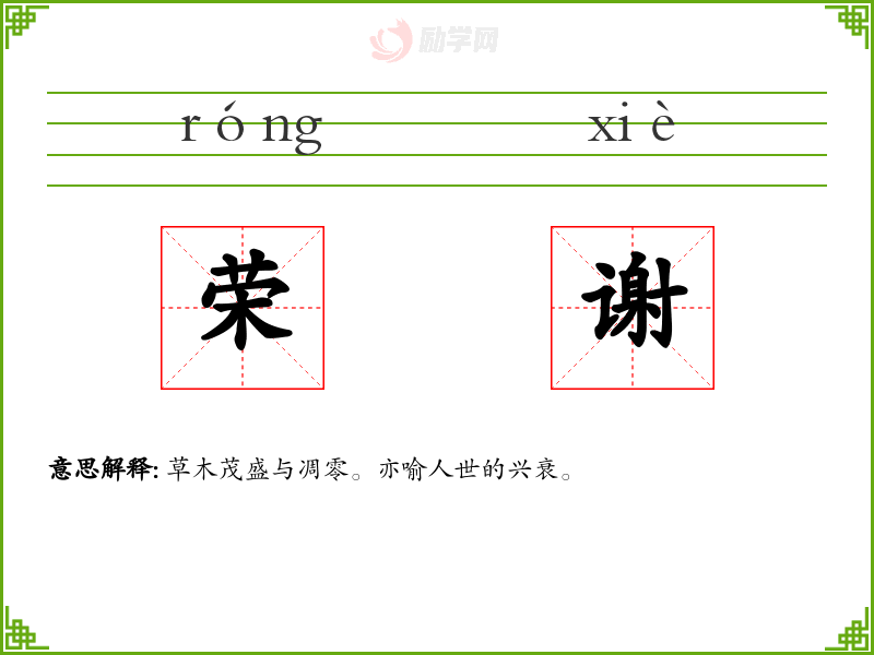 荣谢的意思是:草木茂盛与凋零。亦喻人世的兴衰。
