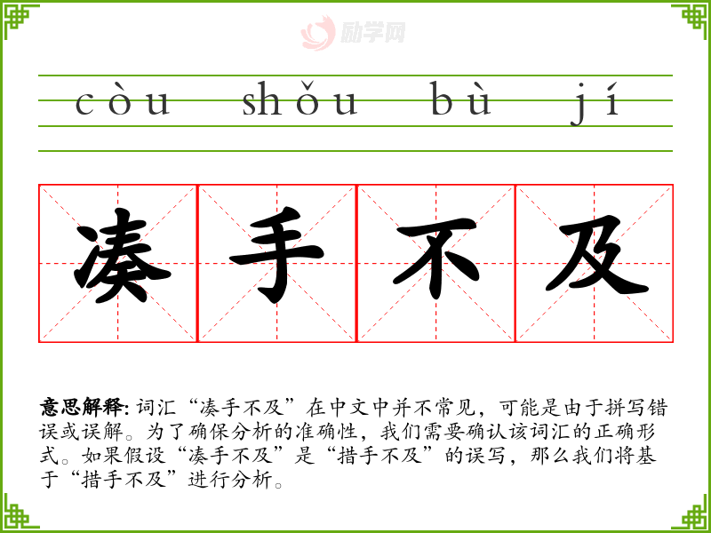 词汇“凑手不及”在中文中并不常见,可能是由于拼写错误或误解。为了确保分析的准确性,我们需要确认该词汇的正确形式。如果假设“凑手不及”是“措手不及”的误写,那么我们将基于“措手不及”进行分析。