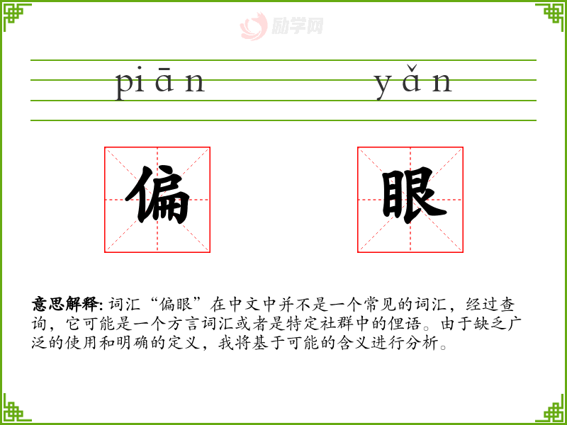 由于“偏眼”不是一个标准词汇,它在不同语境下的使用可能非常有限。在方言或特定社群中,它可能用来形容某人看问题不公正或有偏见。