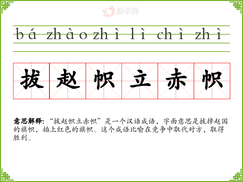 “拔赵帜立赤帜”是一个汉语成语,字面意思是拔掉赵国的旗帜,插上红色的旗帜。这个成语比喻在竞争中取代对方,取得胜利。