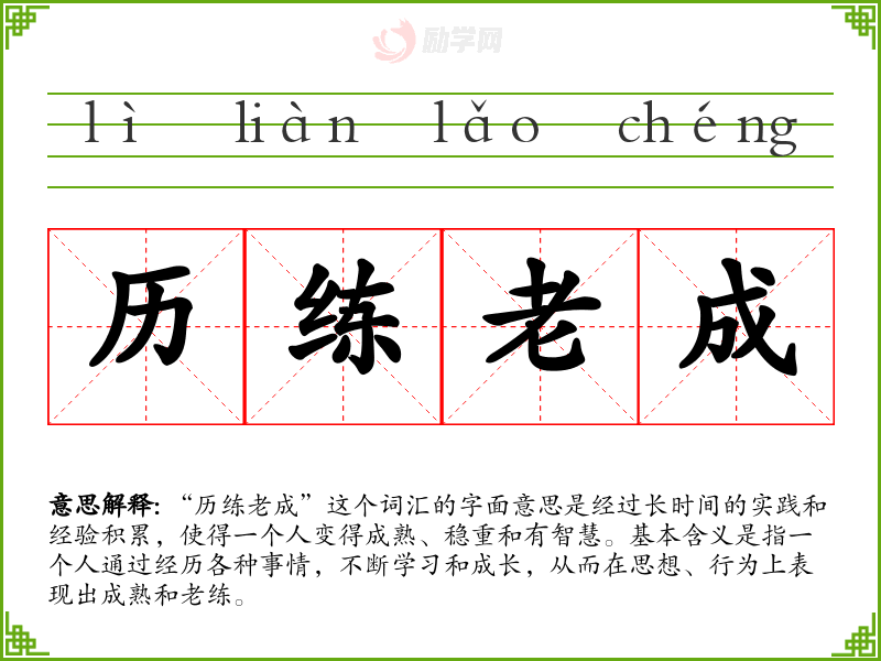 “历练老成”这个词汇的字面意思是经过长时间的实践和经验积累,使得一个人变得成熟、稳重和有智慧。基本含义是指一个人通过经历各种事情,不断学*和成长,从而在思想、行为上表现出成熟和老练。