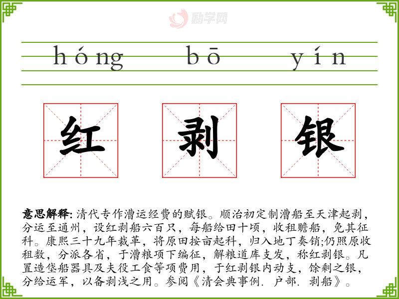 红剥银的意思是:清代专作漕运经费的赋银。顺治初定制漕船至天津起剥,分运至通州,设红剥船六百只,每船给田十顷,收租赡船,免其征科。康熙三十九年裁革,将原田按亩起科,归入地丁奏销;仍照原收租数,分派各省,于漕粮项下编征,解粮道库支发,称红剥银。凡置造垡船器具及夫役工食等项费用,于红剥银内动支,馀剩之银,分给运军,以备剥浅之用。参阅《清会典事例.户部.剥船》。
