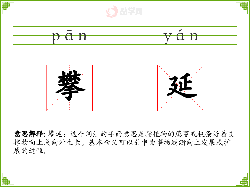 攀延:这个词汇的字面意思是指植物的藤蔓或枝条沿着支撑物向上或向外生长。基本含义可以引申为事物逐渐向上发展或扩展的过程。