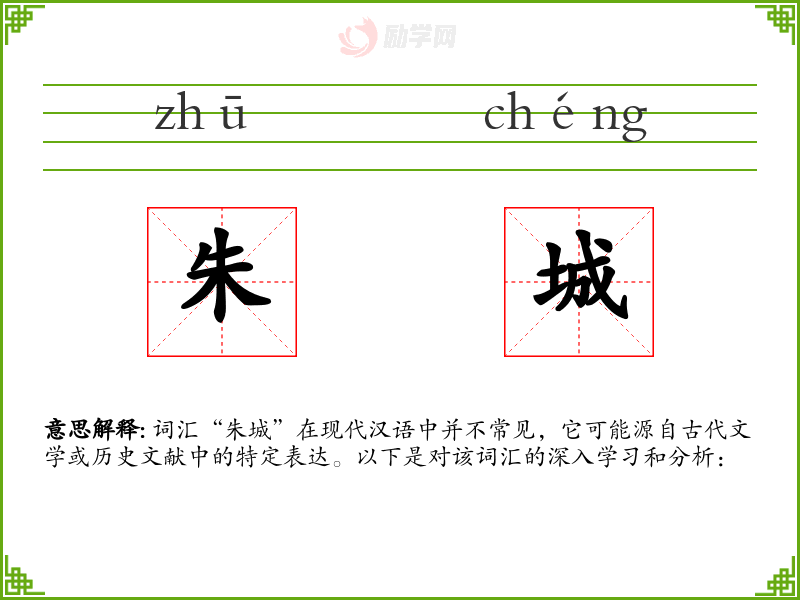 词汇“朱城”在现代汉语中并不常见,它可能源自古代文学或历史文献中的特定表达。以下是对该词汇的深入学*和分析:
